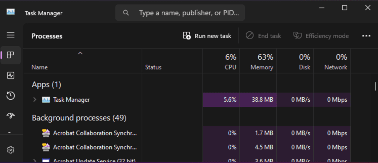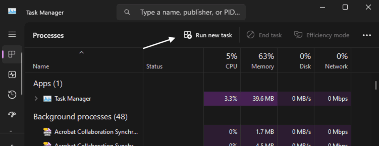 • Press Ctrl + Shift + Esc to open the Task Manager and click File > Run new task.