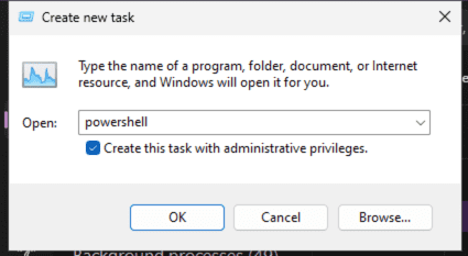 • In the box, type powershell; check the box that says Create this task with administrative privileges; and then click OK.