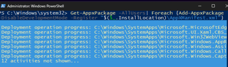 Get-AppxPackage -AllUsers| Foreach {Add-AppxPackage -DisableDevelopmentMode -Register "$($_.InstallLocation)\AppXManifest.xml"}
