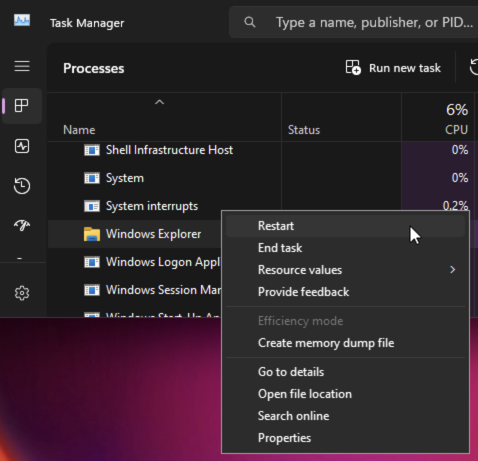 • Right-click Windows Explorer and click Restart.